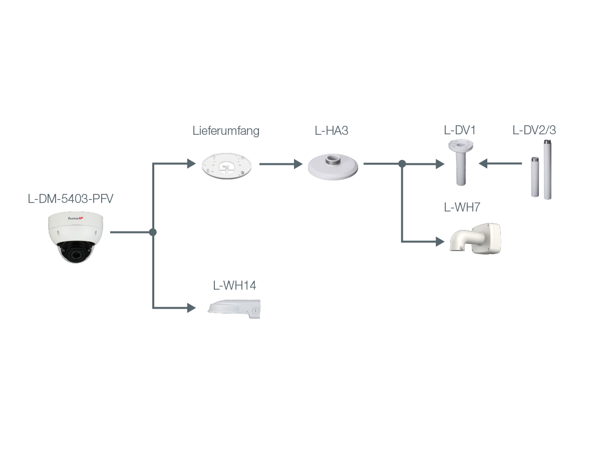 Die L-DM-5403-PFV ist eine 4 Megapixel IR Domekamera (IP), die neben IVS-Funktionen auch über neueste KI-Technologie verfügt. Das Gehäuse mit innenliegender Kabelführung ist wetter- und vandalismusgeschützt (IP67/IK10). Der 1/1,8" CMOS Sensor liefert eine max. Auflösung von bis zu 2688 x 1520 px bei max. 50 bps. Die Kamera ist ausgestattet mit einem 2,7 mm - 12 mm Motorzoom-Objektiv, IR-LEDS (Reichweite bis 40 m) und einem mechanischen IR Cut Filter (ICR). Die Bilder können über fünf unabhängige Streams abgerufen werden. Die Spannungsversorgung kann wahlweise über 12 V DC, 24 V AC oder PoE+ erfolgen.