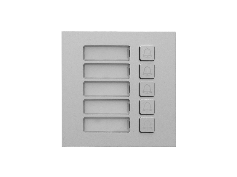 Das L-TA-5705 ist ein Türsprechanlagenmodul für den Außenbereich (IP65) mit einer Aluminium-Frontplatte und 5 Klingeltasten. Es ergänzt das Kamera-Hauptmodul. Eine separate Spannungsversorgung ist nicht nötig, diese erfolgt über den Anschluß zum Hauptmodul. Das L-TA-5705 ist nach IK07 schlagfest. Zusammen mit anderen Modulen (Kamera, Kartenleser,Fingerabdrucksensor und Tastatur) lässt sich flexibel eine Türsprechanlage kombinieren.